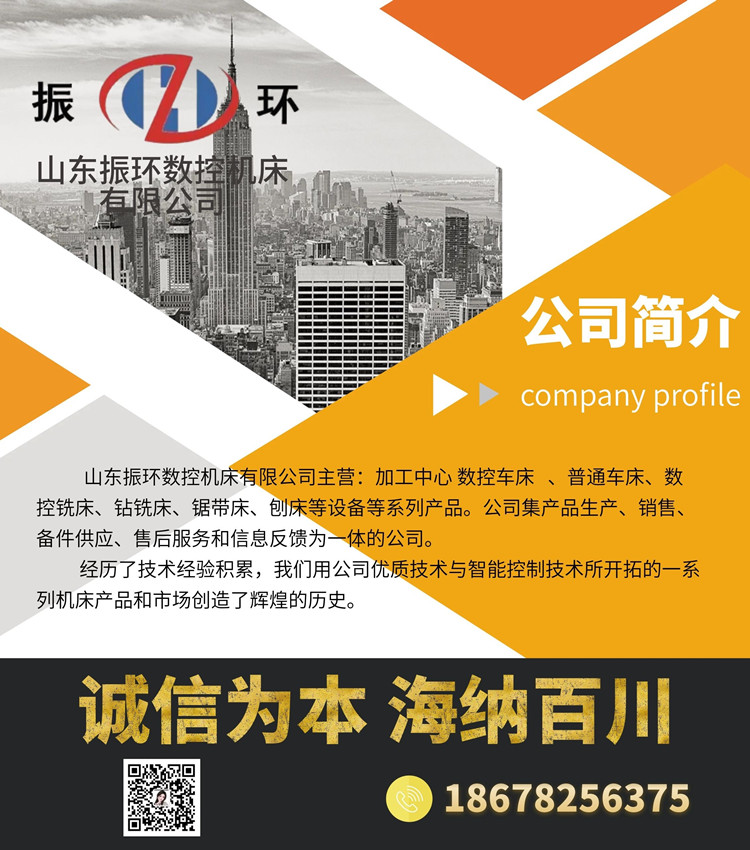 ABOUT US山东振环数控机床有限公司注册地址位于山东省枣庄市滕州市州经济开发区恒源南路1086号,注册机关为滕州市市场监督管理局,法人代表为陈鹏宇,经营范围包括一般项目:数控机床销售;数控机床制造;机床功能部件及附件制造;机床功能部件及附件销售;金属成形机床销售;建筑工程用机械制造;建筑工程用机械销售;电子产品销售;机械零件、零部件加工;金属成形机床制造;五金产品零售。(除依法须经批准的项目外,凭营业执照依法自主开展经营活动)